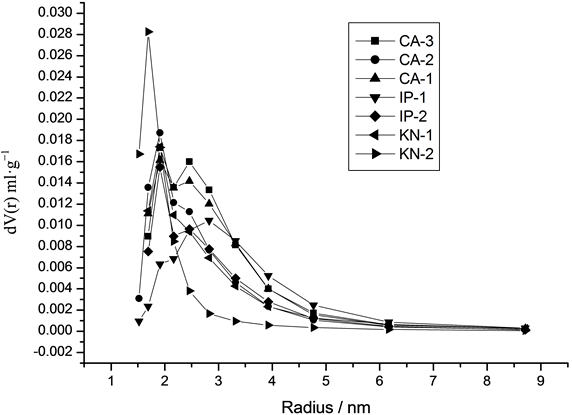 The physical parameters of the catalysts are shown in Figure 5 and Table 1. Figure 5 shows that the preparation method and raw materials have a substantial effect on the pore distribution of catalysts. The catalysts prepared using the kneading molding method had a smaller pore size and a smaller surface area (Table 1) than those prepared using other methods. Regarding the raw materials, chromic nitrate facilitates the formation of large pores. The sample containing pure chromium hemitrioxide (CP-1) had an extremely lower surface area and pore volume than other catalysts; in other words, the addition of aluminum results in a large surface area. The samples prepared by physically mixing chromium hemitrioxide and aluminum oxide and by using the impregnation method had similar surface area and pore size, indicating that aluminum primarily determined the physical parameters of the catalysts.