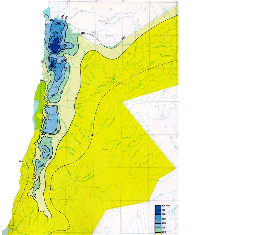 Jordan’s weather is classified as semi-arid to arid with hot and dry summers, and cold and wet winters. Jordan’s precipitation (Figure 2) varies in magnitude, intensity, and distribution. Most of the precipitation in Jordan oc- curs between the months of October and May of each year [2] . The average annual precipitation in Jordan is 50 - 200 mm, 100 - 300 mm, and 200 - 600 mm in Jordan’s Desert, Jordan’s Valley, and Highlands, respectively. In a typical wet year, the total precipitation is about 1200 MCM and is half of that in a typical dry year. The evapora- tion rates in Jordan vary from 63% from the highlands to 99% from the desert. The typical long-term evaporation average is 93%.