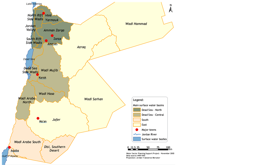 Jordan is a small county located in the Middle East. Jordan has borders with Saudi Arabia, Syria, Iraq, and Israel (Figure 1). Jordan was established in 1921 and has very limited natural resources. Jordan’s current (2008) population is 6.5 million. The country has a total land area of 750,000 km2, about one third (92,300 km2) of which is dry land while the other two thirds (329,000 km2) are ir- rigated land. Jordan is considered as a water poor country due to unreliable and shortages in the supply of water sector. This makes it very difficult to meet the required and steadily increasing demand. Impact of climate change adds a layer to the uncertainty on the supply side of Jordan’s water portfolio. This paper addresses the water supply challenges that Jordan faces and what has been accomplished to improve supply and/or reduce demand. Many projects were undertaken or planned by the Jordanian government to increase the water supply and improve its relia- bility. Completing the proposed projects will result in Jordan meeting its water demand [1] . Otherwise, the Jordanian Government implement some or all the proposed short term solu- tions as presented in this paper.