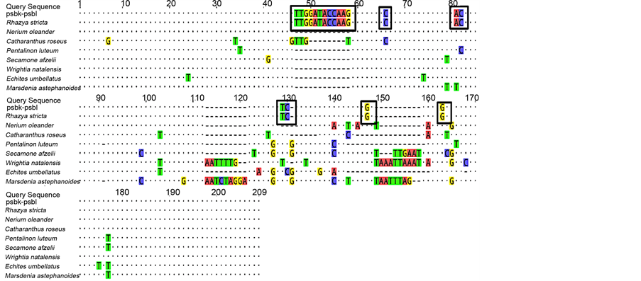 Figure 1. Multiple-sequence alignments highlighting the variable informative sites in the psbK-psbI locus from R. stricta sample sequences.