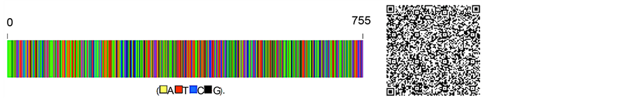 The purpose of DNA barcoding is to accurately and quickly identify medicinal plants and their products at the molecular level to benefit the consumer. With this aim, the nucleotide sequences of the DNA barcode markers (psbK-psbI and psbK-psbI + atpF-atpH) were considered analogous to the products’ barcodes in a supermarket and were converted to two-dimensional barcodes (i.e., QR codes) (Figure 3). The colors in the bars represent nucleotides of the marker, and the numbers at the ends denote the lengths of the markers. After scanning the two- dimensional barcode on a mobile terminal, a message can be sent to a DNA barcode database, where the authenticity of a plant or specimen, such as R. stricta, can be checked. This will aid the ability of consumers with no prior knowledge of DNA barcoding to accurately identify medicinal plants and their products.