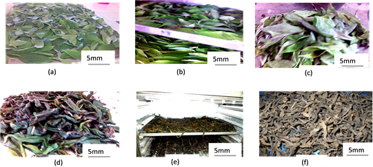 Figure 3. Steps of transformation of Lippia multiflora leaves into green tea. (a) fresh leaves, (b) withering leaves in the oven, (c) withered leaves, (d) rolled leaves; (e) desiccation of leaves in an oven, (f) whole leaf green tea.
