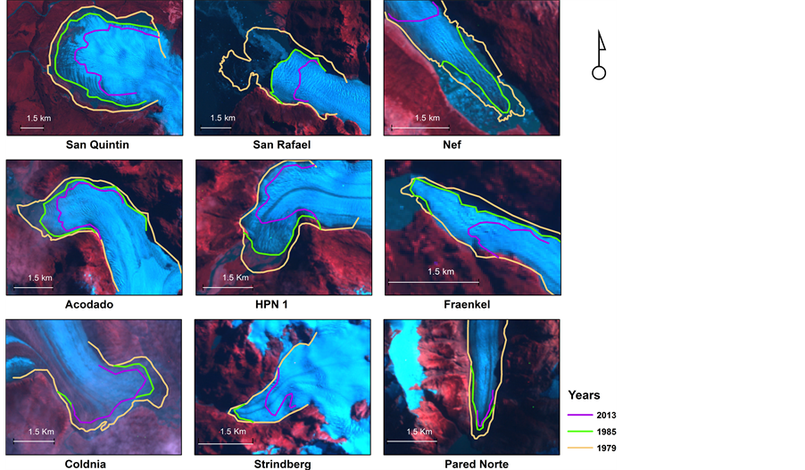 We measured the retreat of nine glaciers in the NPI that occurred between 1979 and 2013 (Figure 2). These glaciers are San Rafael, San Quintin, Colonia, Acodado, HPN-1, Nef, Strindberg, Fraenkel, and Pared Norte. We measured retreat by the change in position of the tongue of the glacier during the study period [21] , as seen in Figure 2.