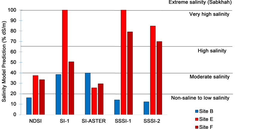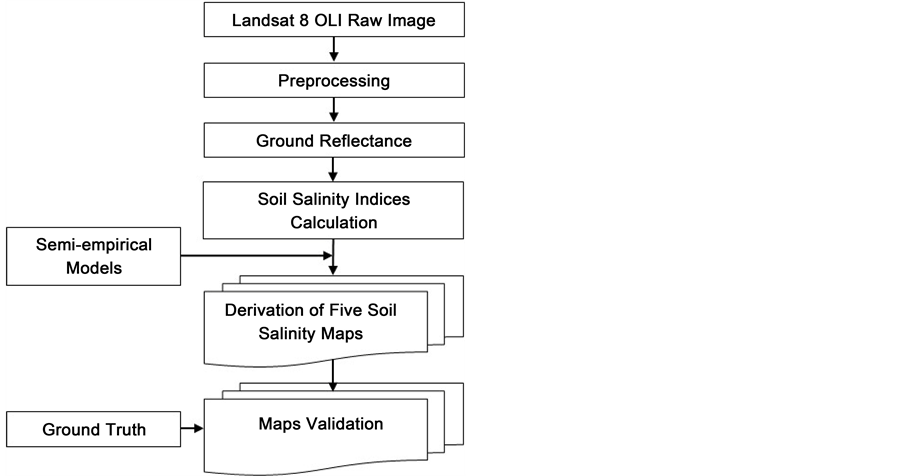 dictive models for soil salinity spatial distribution mapping in an arid environment using OLI Landsat-8 image data. To achieve our objectives, these data were atmospherically corrected, sensor radiometric drift calibrated, and distortions of topography and geometry corrected using a digital elevation model (DEM). Then, five predictive semi-empirical models based on the Normalized Difference Salinity Index (NDSI) [13] , the Salinity Index-ASTER (SI-ASTER) [12] , the Salinity Index-1 (SI-1) [14] , the Soil Salinity and Sodicity Index-1 and Index-2 (SSSI-1 and SSSI-2) [15] were implemented and applied to OLI image data. Finally, for validation purposes, a fieldwork was organized and different important spots-lo- cations representing different salinity levels were visited, photographed, and localized using an accurate GPS (σ ≤ ±30 cm). Based on a priori knowledge of the soil salinity class’s characteristics, descriptive statistics extracted from polygons and/or transects over the selected validation sites were used. Figure 2 summarized the used methodology that will be discussed in details in the subsequent section.