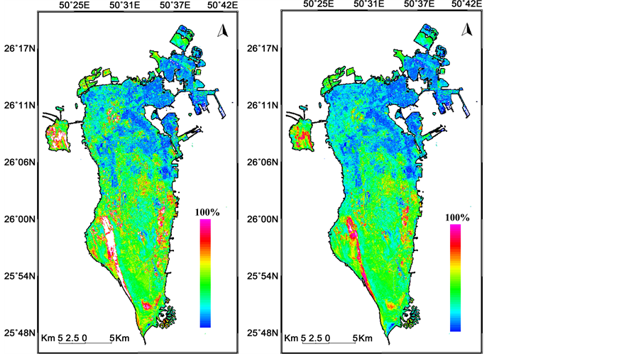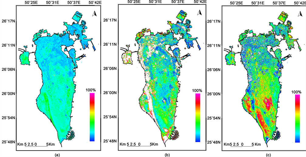 than four decades a global moderate resolution data collection, distribution and archive of the Earth’s continental surfaces [21] to support research, applications, andclimate change impact analysis at the global, the regional and the local scales. The OLI sensor on board of the Landsat-8, collects land-surface reflectivity in the visible, near infrared, and shortwave infrared wavelength regions as well as a panchromatic band, similarly to ETM+ sensor. However, the passes-bands and relative responsivity are narrower than that of the ETM+ in order to minimize atmospheric absorption features [22] . Two new spectral bands have been added: a deep blue visible shorter wavelength (band 1: 0.433 - 0.453 μm) designed specifically for water resources and coastal zone investigation, and a new infrared channel (band 9: 1.360 - 1.390 μm) for the detection of cirrus clouds in the atmosphere. The OLI images have 15 meter in panchromatic and 30 meter in multi-spectral spatial resolutions covering approximately 185 by 185 km. The entire Earth is imaged each every 16 days due to Landsat-8 near-polar circular orbit at 705 km [23] . For this research, the OLI image was acquired on 5th April 2014 over the Kingdom of Bahrain.