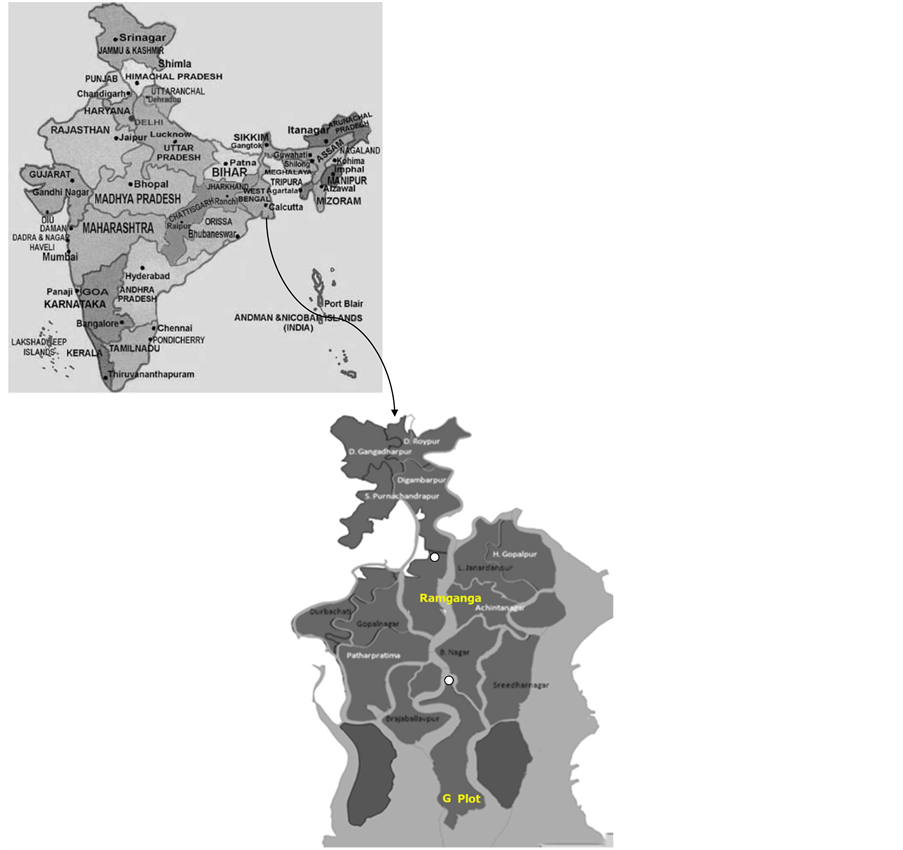 The area for the research study was selected based on percentage of poor and marginalized population, geographic location (deltaic or non-deltaic), availability of transport and village infrastructure as it was hypothesized that poor and marginalized people become more vulnerable after climatic shock and shock induced livelihood insecurity, physical inaccessibility and treatment seeking compared to other population subgroup (Figure 1). The Patharpratima block of the Sundarbans Region under the administrative jurisdiction of South 24 Parganas district of West Bengal is the study area. The area consists of 162,300 male population, 154,618 female population, among which 24 percent is Scheduled Caste and 1 percent is Scheduled Tribe population (Projected population from Census 2001) [46] . The selected Gram Panchayets (lower administrative level) from the block—G Plot is the deltaic GP and Ramganga is the non-deltaic GP. In the selected village Rajrajeswarpur of Ramganga GP, 52 percent population and in the another selected village Krishnadaspur of G Plot GP 60 percent population belongs to SC and ST category as per projected population calculated on 2001 Census figure.
