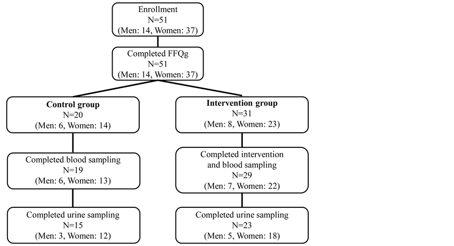 Of the 51 recruited participants, 38 completed the study (15/20 in the control group, 23/31 in the intervention group). Of the participants who failed to complete the study, 2 subjects (1 control, 1 intervention) were lost to follow-up after the intervention period, 10 (4 control, 6, intervention) did not complete urine sampling, and 1 subject in the intervention group was omitted from data analysis due to poor compliance in drinking vegetable juice (Figure 1).