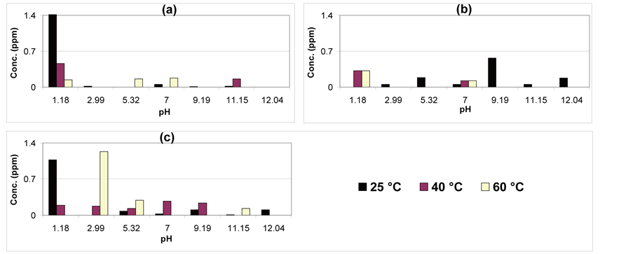 Figure 10. Concentration of Zn (ppm) in the leachate as determined by ICP. (a) Ash at 550˚C, (b) ash at 750˚C, (c) ash at 950˚C.