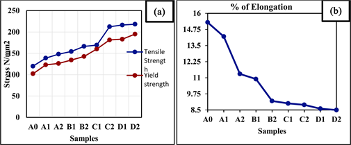 Figure 9. (a) Tensile strength & Yield strength; (b) Percentage of elongation.
