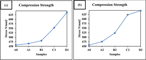 Figure 10. (a) Compression Strength of Al 2024-boron MMCs (b) Compression Strength of Al 2024-boron-Gr Hybrid MMCs.