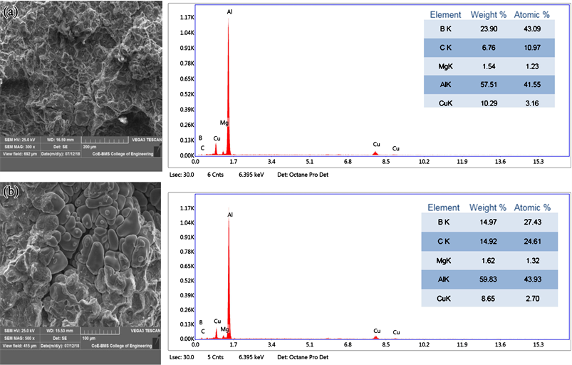 The composites with different volume fraction are examined to analyze the particle distribution by scanning electron microscope (SEM). The SEM images show uniform distribution of particles into the matrix. The dark colour represents the presence of boron fiber powder and graphite particles. EDAX analysis was also carried to confirm the presence of boron and graphite in the matrix. The result shows, there is presence of boron and graphite in the matrix and peak representation of boron (b) and carbon (c) is as shown in Figure 5 this confirm the presence of boron and graphite. SEM and EDAX analysis of boron and graphite reinforced Al 2024 hybrid MMCs is as shown in Figure 6(a) and Figure 6(b).