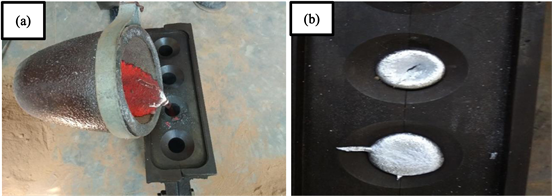 Figure 2. (a) Pouring molten metal into metal die; (b) Solidified casting samples.