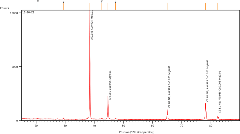 X-ray diffraction (XRD) is conducted to identify different phases present in the samples. XRD technique is conducted with a computer-controlled diffractometer fitted with Ni filter which was operated at 30 kV voltage and 20 mA current with Cu-k α radiation. The diffraction angle (2 h) range is given from 20˚ to 90˚ at a scan speed of 2˚/min. XRD testing reveals the percentage of different alloys present in the cast composite and also used to identify the chemical reaction between the material [10] .