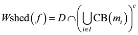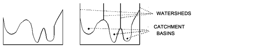 The diagrammatic descriptions of watershed lines and catchment basins have been presented in Figure 1. An algorithmic definition of the watershed transform by simulated immersion was given by [2] . Consider a digital grey value image,
