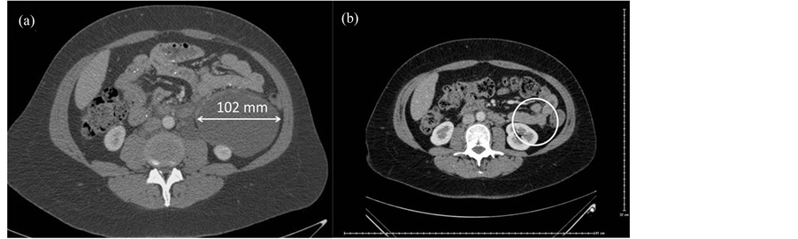 Bilateral LuTX was performed in Vienna in January 2012. Postoperatively she received triple immunosuppressive therapy including tacrolimus, mycophenolate mofetil and prednisolon. After two weeks surveillance bronchoscopy confirmed A2B1-2 rejection, following steroid shot treatment control transbronchial lung biopsy was negative for rejection (A0B0). Lung function has been gradually improving. The six-month chest-abdo- minal CT scan showed an enlargement in the angiomyolipoma located in the upper RP (Figure 1(a)) compared to the preoperative state. In October 2012, 9 months after TX everolimus (plasma level: 2.31 ng/ml) was added to tacrolimus (plasma level: 7.7 ng/ml) therapy, while combination with mycophenolate mofetil and prednisolon maintained. Six month after the introduction of combination therapy with mTOR inhibitor the angiomyolipoma was not detectable on the one year chest-abdominal CT (Figure 1(b)). The patient is since on everolimus, tacrolimus, mycophenolate mofetil and prednisolon therapy with the same plasma level as the combined therapy started, showing excellent graft function (lung functional values October 2014: FVC 3.63 L (110% predicted), FEV1: 2.59 L (91% predicted), FEV1/FVC: 71%), and no signs of abdominal disease on the abdominal CT scan performed 2 years after LuTX.