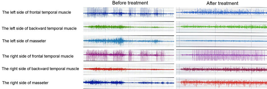 Figure 6. No significant changes in voluntary muscle activity for closing the jaws were seen between before and after surgery according to EMG.