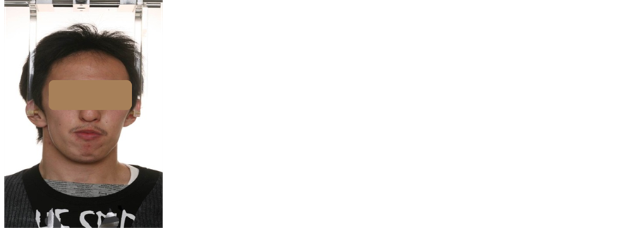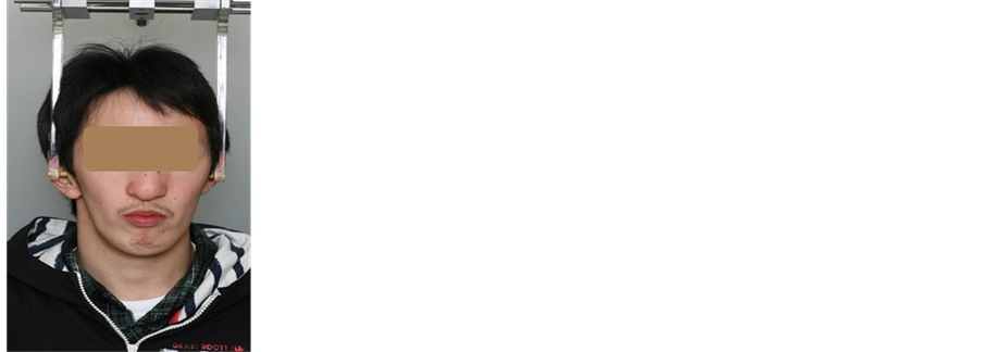 Preoperative extraoral examination showed reversed occlusion and deformation of the facial appearance (Figure 1, Figure 2). In addition, constriction bands and deformation of the limbs were identified (Figure 3). Preoperative intraoral findings exhibited the angle class two malocclusion and severe skeletal open bite (Figure 2). The patient could not speak his lines smoothly and maintain a closed position of the jaws due to weakness of the masticatory muscles. Preoperative cephalometric analysis showed poor growth of the maxilla and false mandibular prognathism (Table 1). MRI showed atrophy of the masticatory muscles (Figure 4). Severe muscle weakness induced poor development of the mandibular ramus, resulting in severe open bite (Figure 5). We therefore attempted to achieve functional recovery using muscle function therapy pre- and postoperatively. We performed Lefort type I osteotomy and mandibular sagittal splitting osteotomy under general anesthesia in May 2010. We placed two bone screws on the maxilla and mandible and performed inter-maxillary fixation for 1 week from postoperative day 2. Since preservation of the teeth was a key consideration, ideal overbite was not apparent on postoperative intraoral examination. With the release of intermaxillary fixation, occlusion was not stable. We performed objective therapeutic evaluations before and after surgery using electromyography (EMG) and tests of masticatory and language functions.