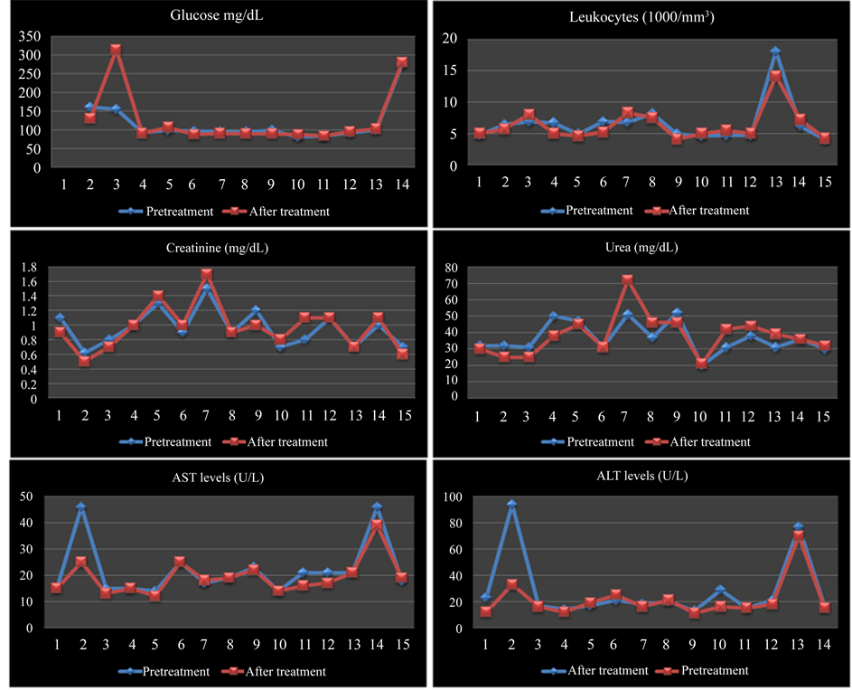 Figure 2. Levels of glycemia, leukocytes, creatinine, urea, serum ALT and AST.