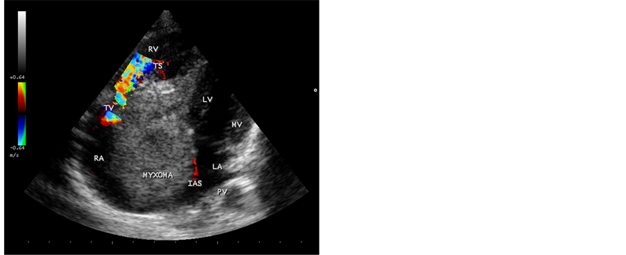 In this case report, a large right atrial myxoma, 69.5 mm × 38.1 mm in size, with a basal attachment to the entire portion of interatrial septum, prolapsing into right ventricle through the tricuspid valve and it’s floating part protruding into the main pulmonary artery in a 12-year old male child was visualized by transthoracic 2D echocardiography. Figures 1-3 revealed the myxoma occupying in the right atrium and prolapsing into the right ventricle through the tricuspid valve, extending into the right ventricular outflow tract and protruding into the pulmonary artery through the pulmonary valve. Color-flow Doppler Figure 4 and Figure 5 revealed the tricuspid and pulmonary obstructions as moderate stenosis of the valves.