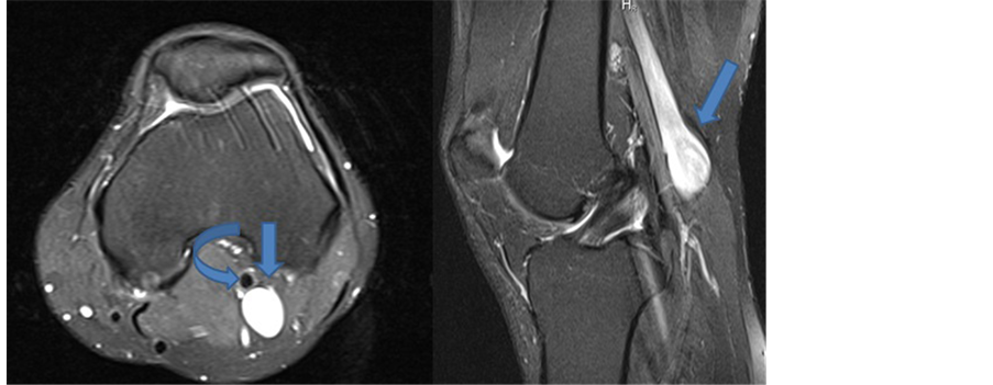Figure 3. Axial and sagittal fat suppresed proton density MRI images demonstrates left popliteal aneurysm (arrows) posterior to popliteal artery (curved arrow).