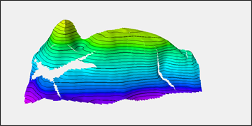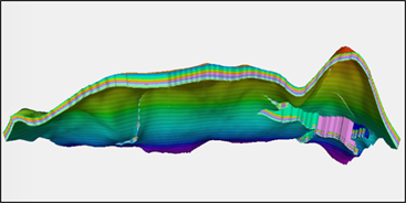 Three horizons were modeled. The reservoir was then subdivided into 8 zones based on well tops. Several layers were then added within each zone. Figure 10 shows one of the horizons created to mirror the original sedimentary layer, Figure 11 shows the different zones created by the horizons and Figure 12 shows an up-close image of the layers created within the zone.