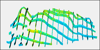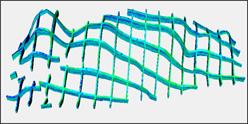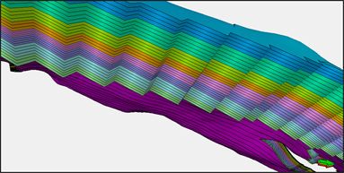 Stratigraphy modeling involves vertical layering of the 3D grid using horizons and layers. This is the characterization of the internal structure of the model. It involves building the vertical layering in the model. The vertical sequence of the layers mirrors the original lateral distribution of sedimentary environments and is guided by the interpreted depositional surfaces on seismic sections.