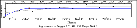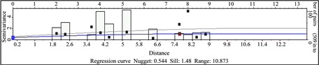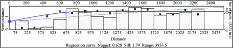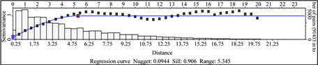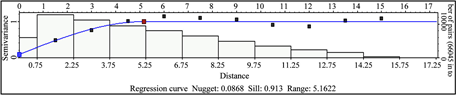 A variogram is basically a display of the mean square difference between two values as a function of their increment [7] . The value of a variogram is calculated by