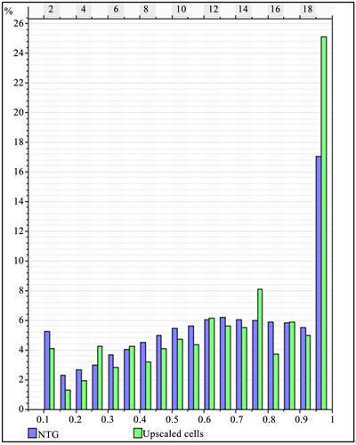 NTG was also modeled to isolate the productive and non-productive parts of the reservoir. Figure 41 displays the vertical direction variogram for NTG while Figure 42 displays the minor direction variogram for NTG. The three-dimensional NTG model is shown in Figure 43 and the NTG model slice structure is shown in Figure 44. Figure 45 shows the NTG map and Figure 46 shows the NTG histograms for property and upscaled values.