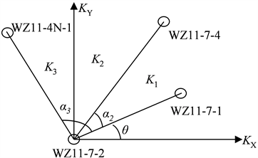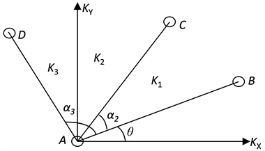 As illustrated in Figure 1, let the angle between the connection direction of well A and well B and the axis of KX be θ, let the angle between the connection direction of well A and well C and be α2, let the angle between the connection direction of well A and well D and be α3, let the permeability between well A and well B, well A and well C, well A and well D be K1, K2, K3 respectively. Then, from the geometric relationship of Figure 1