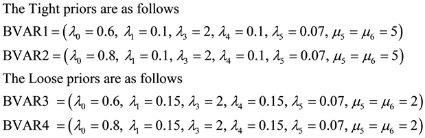 Our choice of Normal-Inverse Wishart prior for the BVAR models follow the work of Kadiyala & Karlsson, [17] that Normal Wishart prior tends to performed better when compared to other priors. In addition Sims and Zha, [12] proposed Normal-Inverse Wishart prior because of its suitability for large systems while Breheny, [18] reported that the most advantage of wishart distribution is that it guaranteed to produce positive definite draws. Our choice of the overall tightness