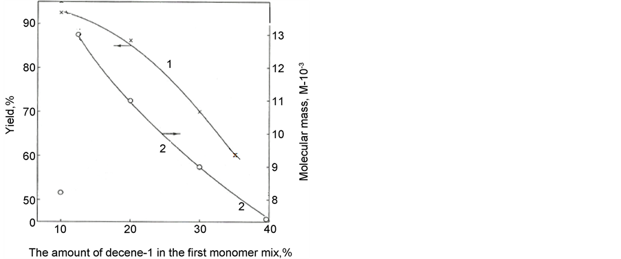 Figure 1. The dependence of the yield (1) and molecular mass (2) of the copolymer from the amount of decene-1 in the first monomer mix.