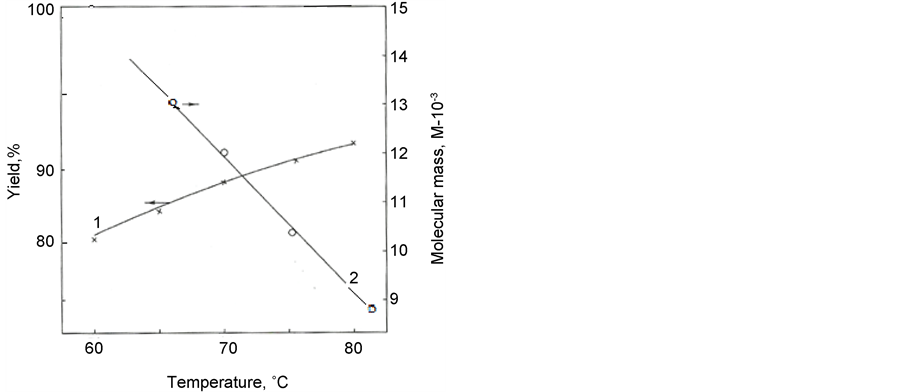 The learning of the dependence of the polymers yield and molecular mass from the temperature shows that, the increase of the reaction temperature from 60˚C up to 80˚C increase the copolymers yield from 80.2% up to 93.3%. Only at this moment the price of the molecular mass reduces from 13,000 up to 8700 (Figure 2). It means that, the temperature increases the speed of the reactions causing the break of polymerization chain speed together with polymerization speed―that is, the increase of the temperature increases the speed of all reac- tions.