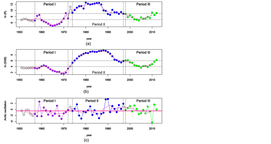 Figure 3 further shows three loops surrounding the regression line for three levels of SSB. One loop was formulated for low ln(SSBt) values around 2 to 4, which correspond to the years from 1957 to 1972 (we will call these years Period I). The second loop was formulated for high SSB values in the years from 1974 to around 1997 (Period II). The third loop was a narrow loop formulated along the line and corresponding to the years from 1998 to 2012 (Period III). In each period, the trajectories of ln(R) and ln(SSB) showed cyclic patterns, although the levels of ln(SSB) and ln(R) were all different (Figures 4(a)-(b)). The cyclic patterns of ln(R) coincided with the levels of AO in February (Figure 4(c)). In the years when AO was greater than the average of −0.437 (horizontal line), recruitment showed a decreasing trend, and vice versa. Therefore, it seems that the increasing or decreasing trend of the recruitment had the same strong relationship with the value of AO in February.