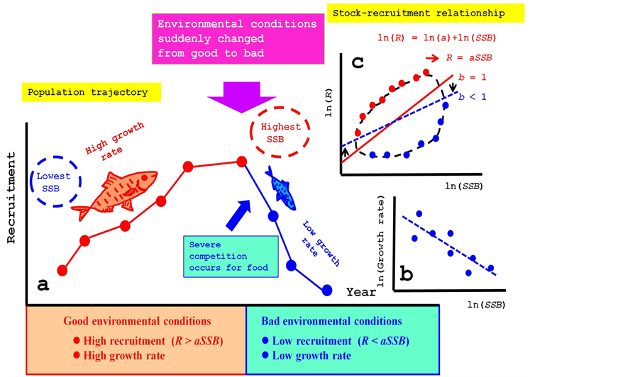 Here I explain using time series data why biologists have come to unconsciously believe in the existence of a density-dependent effect (Figure 2). When the environmental conditions are good for a species, for instance, the temperature is suitable for the species and the abundance of prey is high. Under good environmental conditions, the recruitment and the body size growth rate of fish are higher than those determined under regular environmental conditions. As a result, SSB also increases in response to the high recruitment. When those good conditions continue for several years, the SSB will continuously increase at an extremely high level. However, those good conditions will not continue forever. An abrupt large change from good to bad conditions is likely to occur at some point. The temperature will no longer be suitable for the species, and the abundance of prey will decrease. Then, strong reductions in the survival and growth rates will occur because of the bad environmental conditions. Not only a reduction in recruitment but also reductions in the weight and body size of the fish simultaneously occur at high SSB levels.