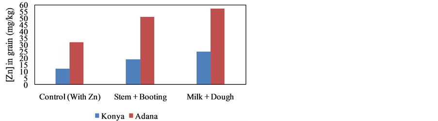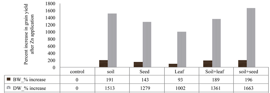 The figure clearly depicts that i) the evaluated methods of Zn application gave different result and ii) durum wheat responded well than bread wheat. Mao [66] has also reported a positive grain in grain Zn concentration due to foliar application of Zinc sulfate in winter wheat. In his study, a 10 mg∙kg−1 of grain Zn concentration was obtained solely from application method. Zn concentration in grain is, however, not linearly associated with either soil or foliar application of Zn but could also be influenced by initial Zn content of the soil and dosage of applied Zn [69] . Their trial demonstrated that grain Zn concentration of durum wheat varies with the initial amount of Zn available in the soil whereby supplementary Zn application had positive impact on Zn deficient soil (Figure 3).