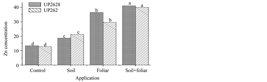Figure 5. Differential response of two contrasting wheat genotypes in grain Zn concentration (µg/g) under different Zn application methods. Dissimilar letters over histograms indicate significant difference at p < 0.05. (Adopted from Mathpal et al. [65] ).