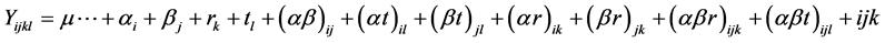 µ∙∙∙ + αj + βj + rk + (αβ)ij is the fixed effects part of the model and tl + (αt)il + (βt)jl + (αβt)ijl + ijkl is the random effects of the model,