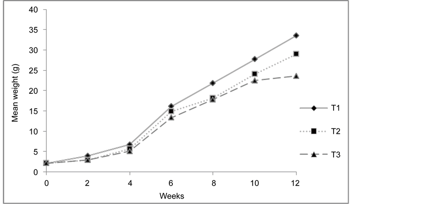 The growth curves showed a gradual growth of fingerlings from the start to the end of experiment (Figure 1). The growth performance indicators and survival rate of fingerlings cultured at the three treatments are shown in Table 1. From the analysis, significant differences (p ≤ 0.05) were observed among the different treatment groups and T1 showed the best performance in growth parameters studied, namely; final weight gain (33.54 ± 0.66 g) and specific growth rate (3.28 ± 0.10%/day). The SGR was significant (p < 0.05) between the treatment groups although, rates for treatment T2 (3.13 ± 0.05) and T3 (2.86 ± 0.15) were similar.