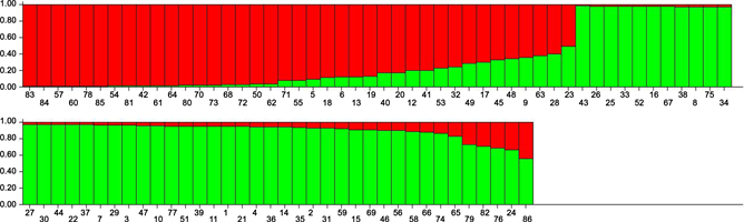 Figure 10. The estimated population structure of fig genotypes using STRUCTURE when ΔK = 2 based on SSR data (The genotypes are represented by a different color according to the population they belong (Population 1: red, Population 2: green).