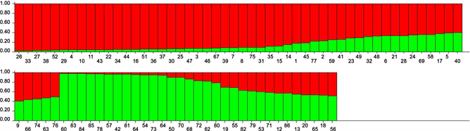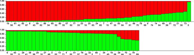 Figure 11. The estimated population structure of fig genotypes using STRUCTURE when ΔK = 2 based on iPBS + SSR data (The genotypes are represented by a different color according to the population they belong (Population 1: red, Population 2: green).