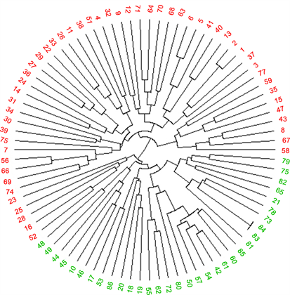 The genetic distance between the pairs of genotypes was used to perform a cluster analysis based on neighbor joining (Figures 2-4). The results of this analysis revealed that 86 fig genotypes formed two main groups of clusters based on the iPBS data. Groups 1 and 2 contained the major genotypes, which were further divided into two subgroups (Figure 2) consisting of 44 (shown in red) and 42 (green) genotypes, respectively. Similarly, using the SSR data, the 86 fig genotypes were divided into two main groups (Figure 3) with 49 (red) and 37 (green) genotypes, respectively. However, the genotypes within the groups were slightly different. The combined data also resulted in two main groups of genotypes (Figure 4) containing 53 (red) and 33 genotypes (green), respectively. The