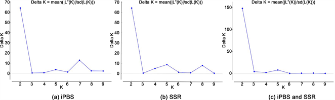 The genetic structure of the whole genotype collection was evaluated by setting ΔK criterion in the STRUCTURE software [31] . The value LnP (K) increased continuously parallel to the increase of K from 1 to 10, and there was no obvious inflexion point. The highest ΔK value was observed at K = 2 in all three analyses (iPBS only, SSR only, and iPBS+SSR) (Figure 8).