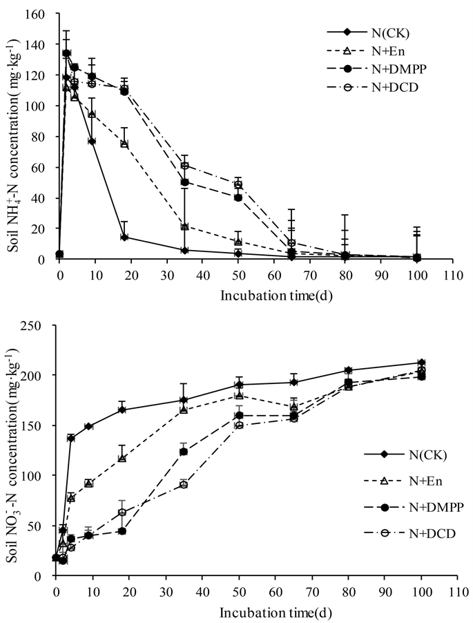 rate of DCD and DMPP treatment was 81.9% - 95.8% and 69.0% - 97.2%, respectively. After that, the nitrification inhibition rate of DMPP was reduced rapidly and DCD treatment was reduced slowly. In the first 65 days of culture, the inhibition rate of nitration by DCD and DMPP treatment was significantly higher than that of En treatment (p < 0.05). After that, the difference in nitrification inhibition rate of each treatment was smaller. In the treatment of three nitrification inhibitors, the treatment rate of nitrification inhibitors by DCD was the highest, followed by DMPP treatment. The results were consistent with the previous text.