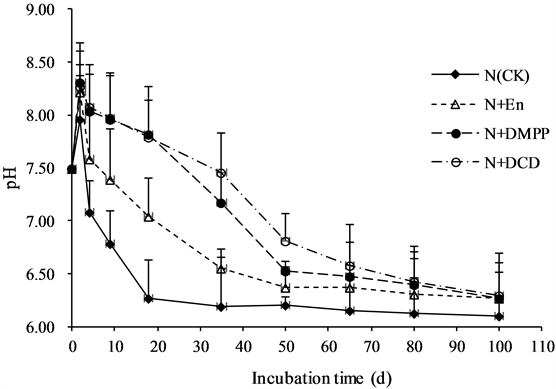 The soil pH increased first and then decreased with the increase of culture time (Figure 2), which is consistent with the change trend of content in Figure 1. The soil pH of each treatment increased to the highest level on the 2nd day after culture, which was 8.0 (CK), 8.2 (En), 8.3 (DMPP) and 8.3(DCD) respectively, and then began to decrease in different amplitude. The pH of CK treatment decreased from 7.5 at the initial stage to 6.2 on the 35th day, the decrease was 1.3, and then the pH decreased slowly (19 - 100 d), and the pH value was 6.1 at the end of culture. From the second day of culture, the pH value of soil treated with En, DMPP and DCD nitrification inhibitor was significantly higher than that of CK treatment (p < 0.01), but there was no significant difference between En and DMPP treatment. Therefore, the addition of nitrification inhibitors to the soil can significantly slow down the soil acidification rate.