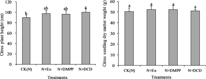 Figure 3. Effect of nitrification inhibitors on plant height and dry matter accumulation of citrus.