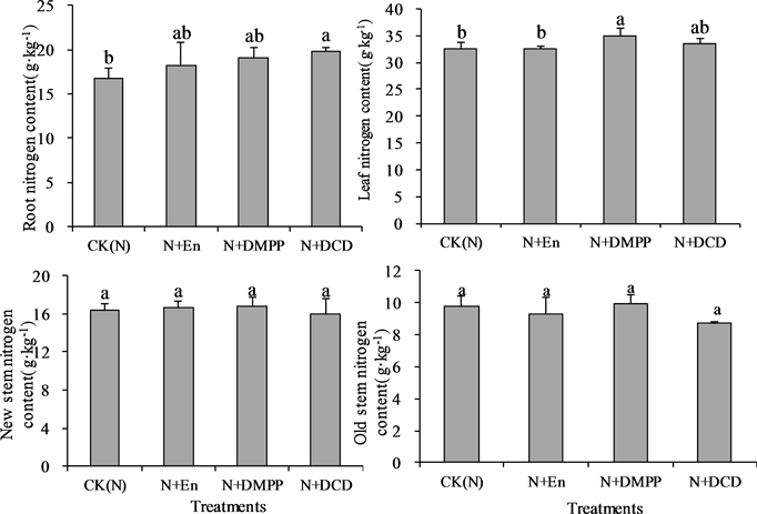 Compared with the control, the application of nitrification inhibition had a certain effect on the content of nitrogen in citrus roots and leaves, and there was no significant difference in the nitrogen content of the old stem and the new stem of citrus (Figure 4). Nitrification inhibitor DCD significantly increased the uptake of nitrogen by citrus roots. The amount of nitrogen uptake was increased by 17.9% compared with the control. The amount of nitrogen uptake in other treated roots was 9.0% - 13.6% higher than that of the control treatment, and the difference was not significant. The nitrification inhibitor DMPP significantly