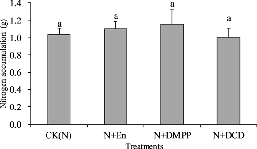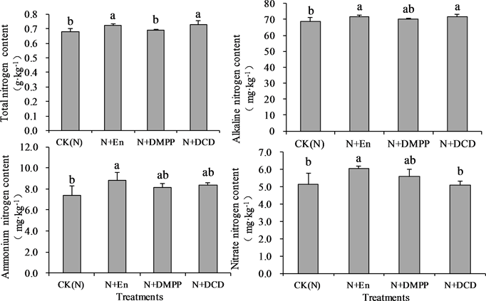 Note: En,2-chloro-6-trichloromethyl pyridine (Nitrapyrin), DMPP,3,4-dimethylpyrazole phosphate, DCD, dicyandiamide. Different lowercase letters in the same column indicate significant difference at p < 0.05 level. The same below.