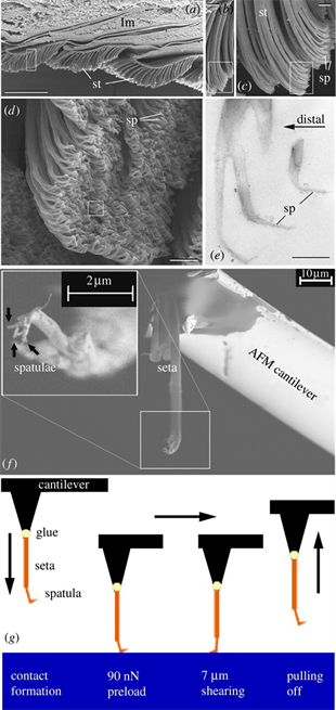 Figure 10. Hierarchical organization of the gecko attachment system (a) longitudinal section of the gecko toe with three lamellae (lm) covered with setae (st) on the ventral side (scale bar, 200 mm); (b) setae (scale bar, 10 mm); (c), (d) setae branching into spatulae (sp; scale bar, 2 mm); (e) spatulae (scale bar, 300 nm; a-d SEM images; e TEM image); (f) single seta with four single spatulae attached to the AFM cantilever (SEM image; 0.5 kV accelerating voltage) [40].
