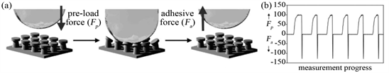 Figure 12. (a) Representation of the measurement of the adhesion between a glass sphere and an adhesive surface with subcontacts. (b) Representative example of macroscale adhesion force data [42].