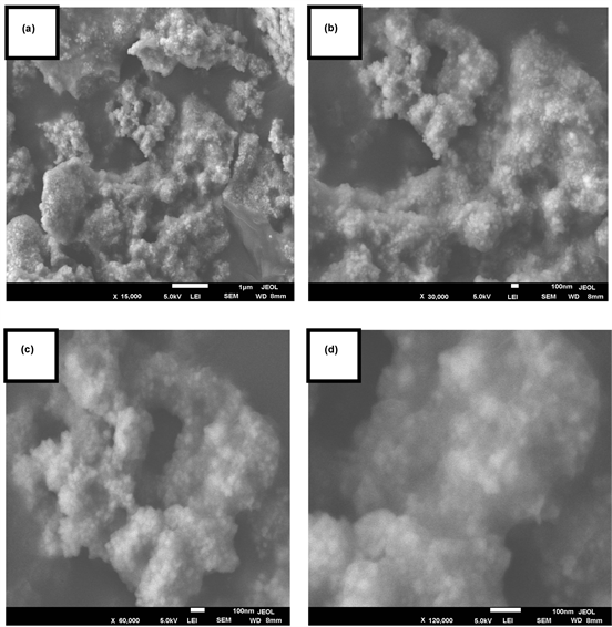 Figure 3. SEM images of A. ampeloprasum AgNPs at different magnifications (a) 15.000×, (b) 30.000×, (c) 60.000× and (d) 120.000×.